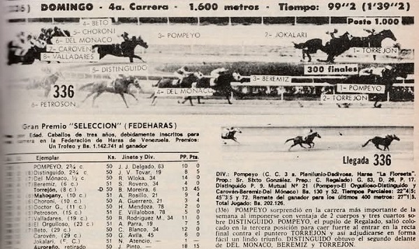 Comparación. Los jinetes de Pompeyo en el año 1977 fueron Rafael Teodoro Chávez (8 veces), Ricardo Ferrer y Freddy Mora (dos veces cada