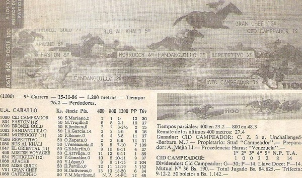 Venezuela del Stud Campeador y entrenado por Alberto Mejía Llamozas), el place lo ocupó Faston con Maritza Trujillo la cual buscaba