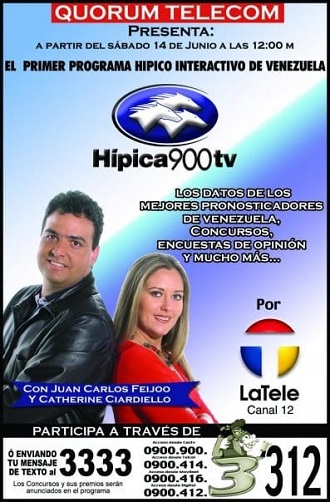 En la cobertura del hipismo internacional Juan Carlos se encargó de hacer la transmisión carrera a carrera de la ruta al Kentucky Derby, ésta culmina con la victoria de Fusaichi Pegasus. A finales de ese año formó parte del equipo que transmitió con Radio Sensación desde Puerto Rico el Clásico del Caribe ganado por My Own Business y el Clásico Confraternidad ganado por High Security, ambos conducidos por Emisael Jaramillo ganando los dos grandes clásicos. En el año 2001 Feijoó debutó con el martillo en subastas de purasangres con ejemplares del Haras Los Cocales y también subasta a un producto del Haras San Isidro de Amin Saiden. En diciembre se encargó de la Gerencia de Desarrollo de Nuevos Negocios de Quorum Telecom y concretó varios proyectos, entre los cuales están el programa de Televisión Hípica 900 T.V. (2003) el cual inicia emisiones en vivo en el canal La Tele. Este programa fue innovador, ya que, incluyo a una joven llamada Catherine Ciardiello quien hacía las entrevistas en el hipódromo y Juan Carlos Feijoó moderaba desde el estudio donde los invitados pronosticaban y daban a conocer sus líneas 900. En 2004, el proyecto se trasladó a Maracaibo con el programa Hípica 900 Zulia desde Maracaibo el cual tuvo un modelo parecido al anterior. |